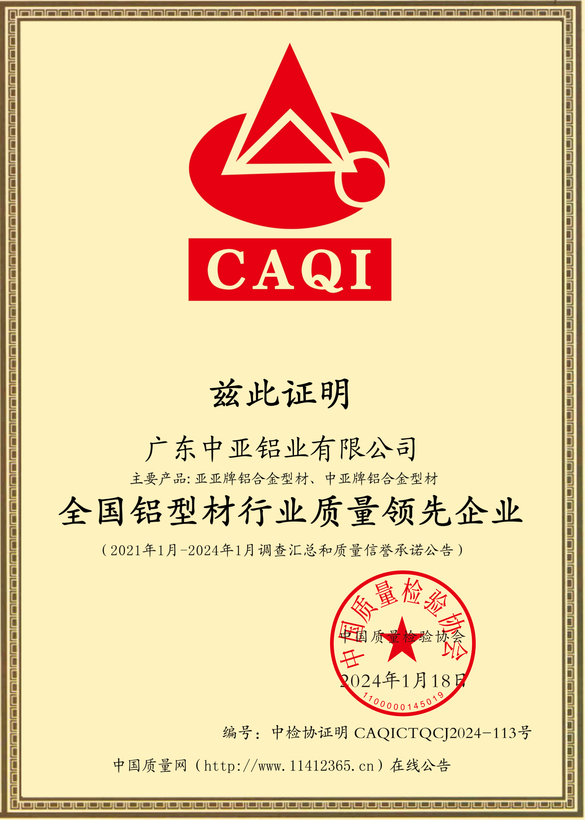 全国铝型材行业质量领先企业